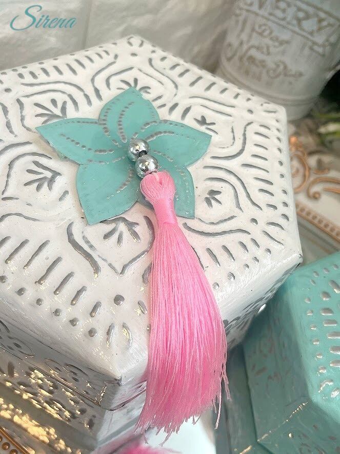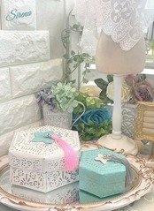 ホワイトとターコイズのBOXにはプルメリアとハスの花が